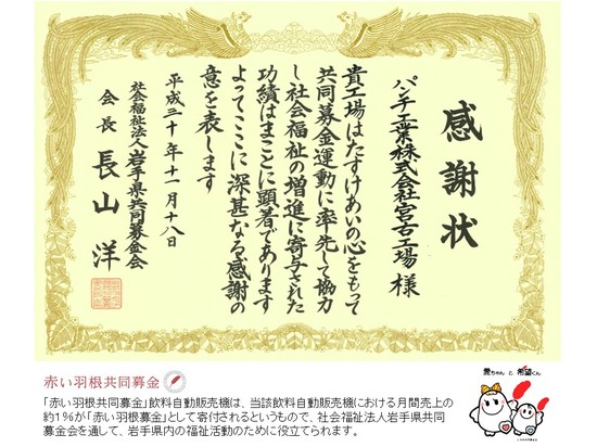 岩手県共同募金会より感謝状を授与されました。